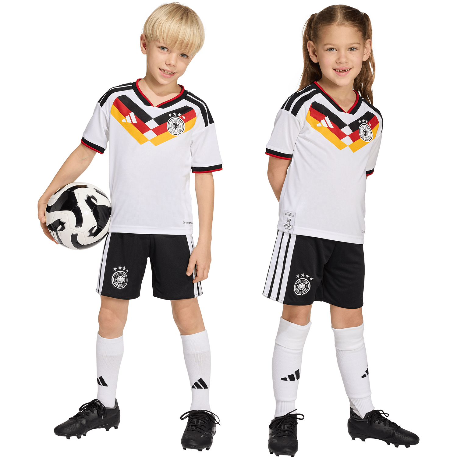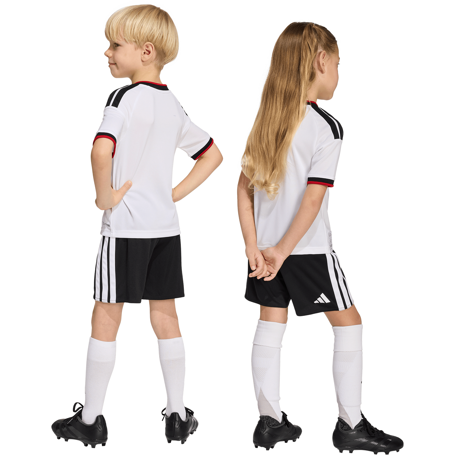 When it comes to football, every detail counts. The Germany 26 Home Replica Set is crafted to inspire young fans. This set pays homage to Germany's football legacy, featuring classic jersey elements from famous moments, reimagined for the future. The integrated Climacool and Aeroready fabric technology wicks and disperses sweat for a cool, dry and distraction-free performance, allowing them to feel fresh and comfortable, whether they're playing on the field or cheering from the stands. With a regular fit, this set offers comfort and freedom of movement, a great choice for active kids. The additional flag label sign-off adds an extra touch of authenticity, making this set a must-have for young football enthusiasts. Let your child step into the world of football with confidence and style wearing this replica set. With adidas, it is more than just clothing. It's a symbol of passion and pride.