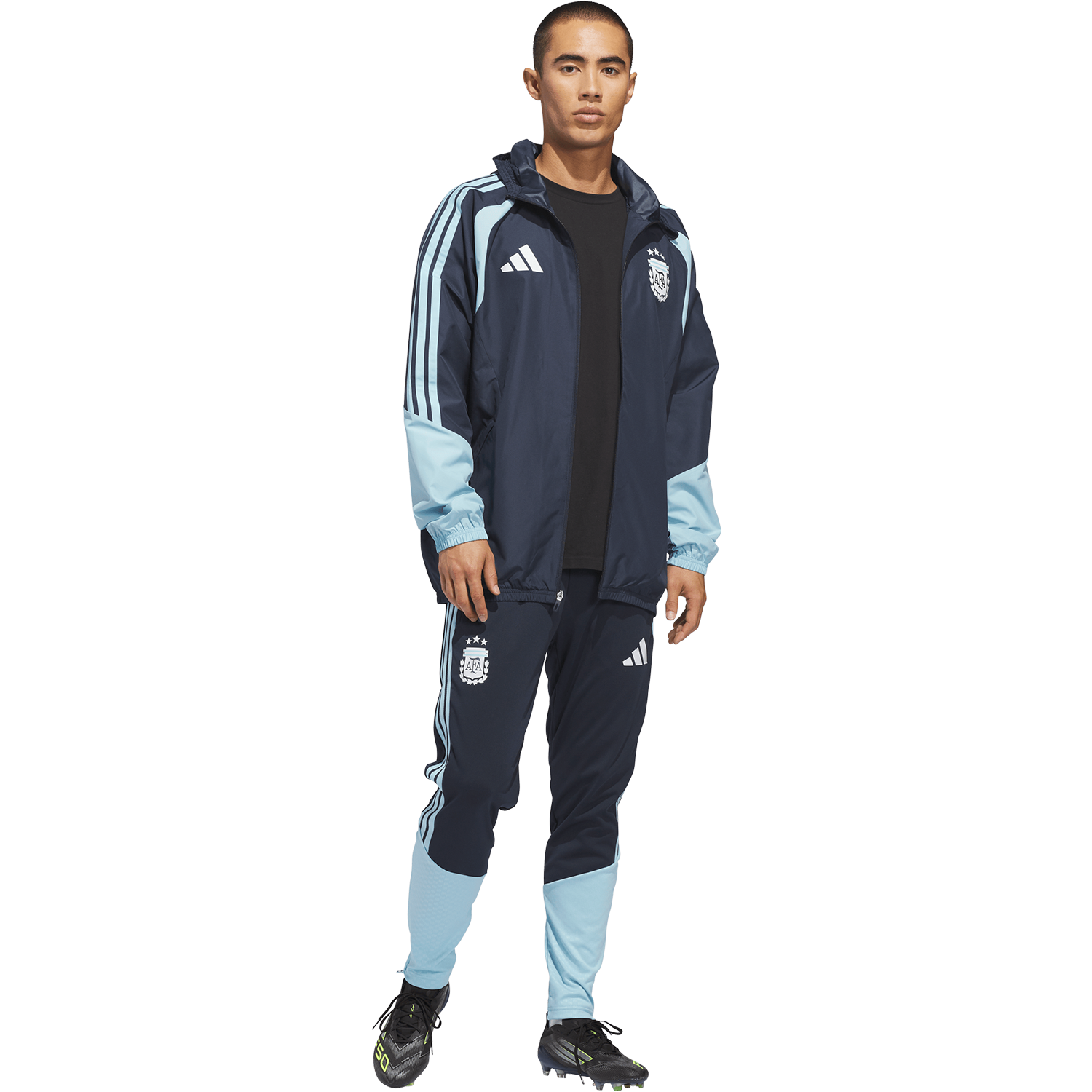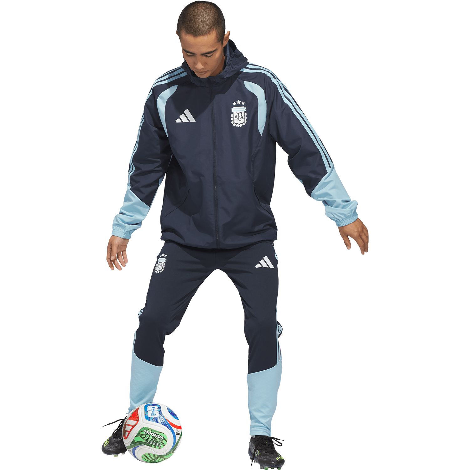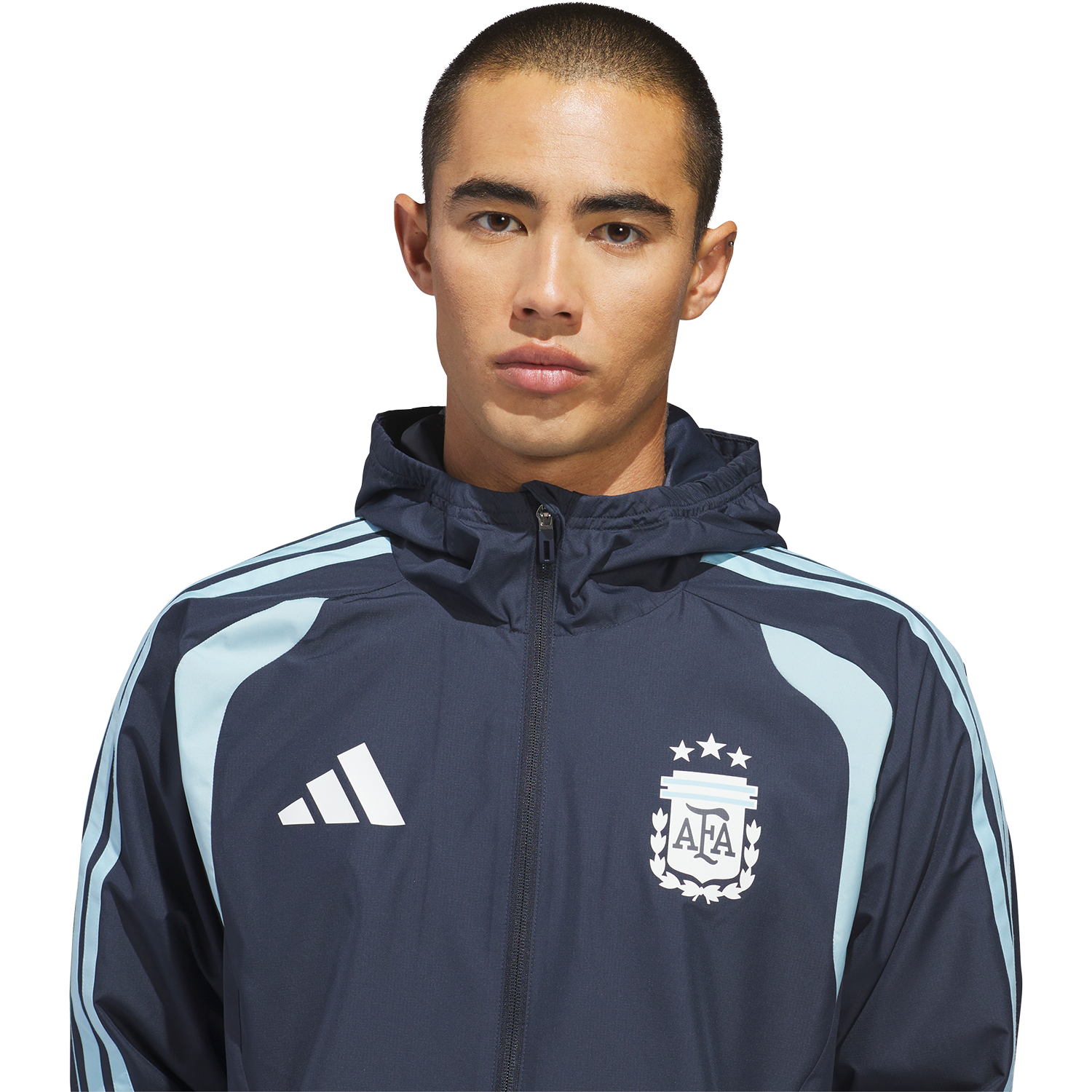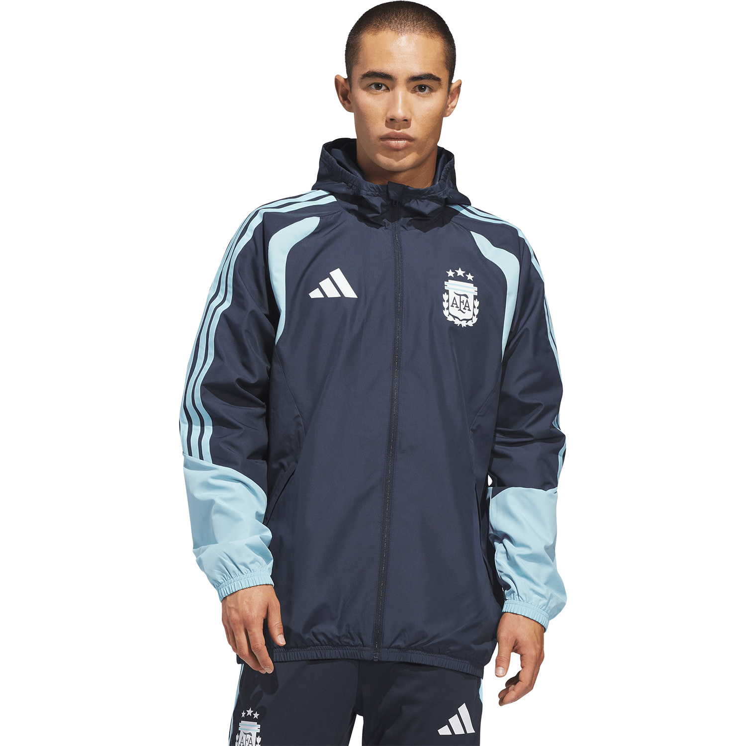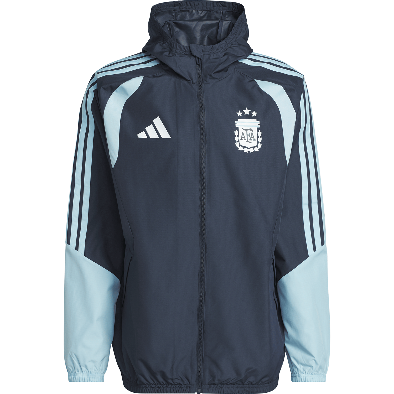 Diseñada para condiciones climáticas cambiantes, la chaqueta Argentina 26 Tiro All Weather lleva el diseño futbolístico de adidas a la cancha, para que estés listo para el día, sin importar lo que te depare el cielo. Esta chaqueta está diseñada para el rendimiento y cuenta con la tecnología adidas Clima365, que incorpora una serie de tejidos de alta tecnología que te ayudan a sentirte listo para el deporte. Resistente al viento y al agua, ayuda a protegerte del viento y repele la lluvia. Una capucha plegable agrega versatilidad, mientras que la cremallera completa facilita y asegura la combinación de capas. El corte regular brinda libertad de movimiento, con detalles ajustables para una silueta limpia y segura. Con las 3 Franjas y el escudo de la AFA, esta es una prenda para todo clima con una identidad futbolística esencial.