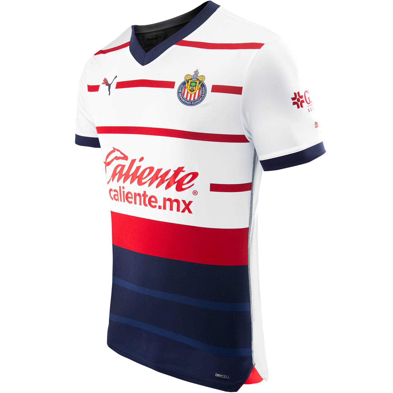 Descubra la cautivadora camiseta de visitante auténtica para hombre Puma Chivas 2023-24 que rinde homenaje a los colores atemporales del club. Con llamativas rayas horizontales rojas en la sección superior y prominentes bloques azules en la espalda, esta camiseta muestra un diseño innovador. Innovando, la sección inferior presenta un patrón horizontal único, una novedad en la historia de las camisetas del club. El panel frontal, las mangas y la espalda están elegantemente presentados en un blanco prístino, complementado por el impresionante logotipo Big Cat que emplea una fascinante técnica de degradado que pasa del rojo vibrante al azul encantador.