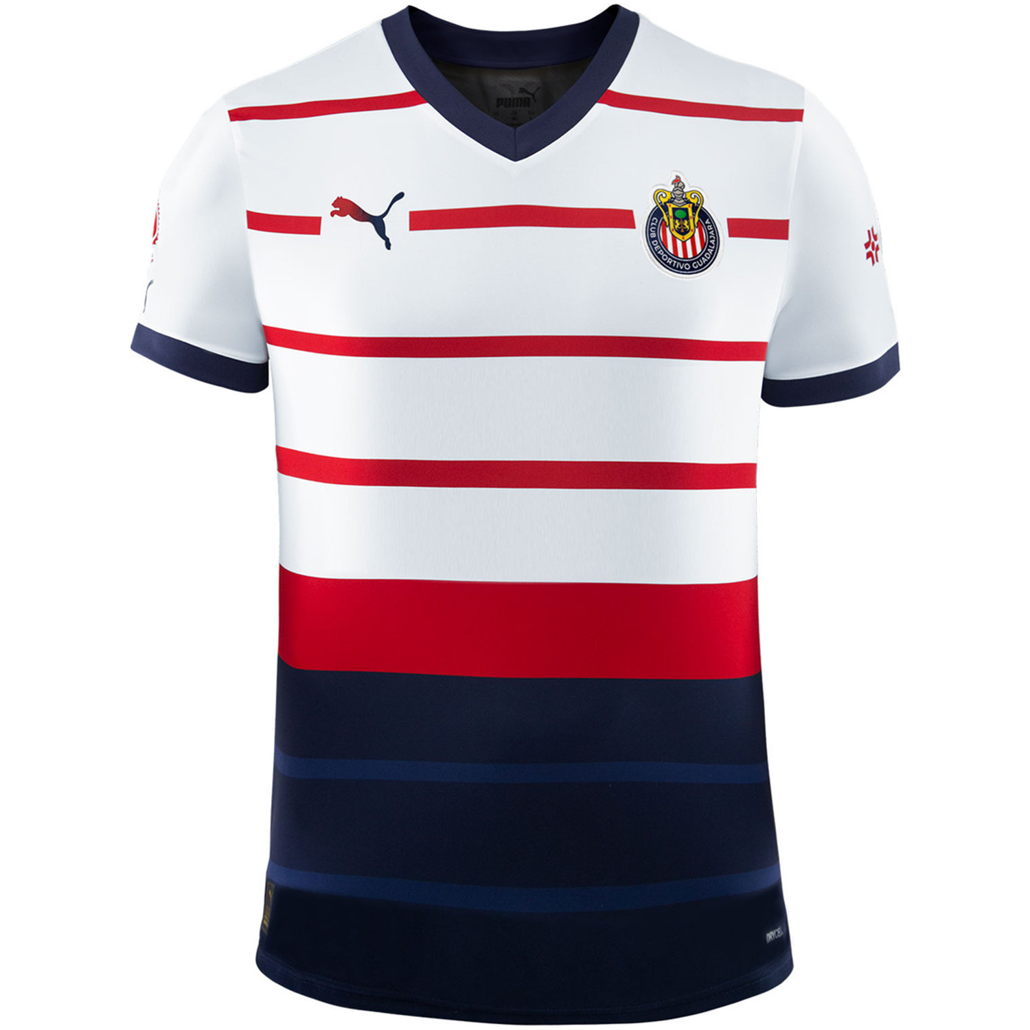 Descubra la cautivadora camiseta Puma Chivas 2023-24 Youth Away Stadium que rinde homenaje a los colores atemporales del club. Con llamativas rayas horizontales rojas en la sección superior y bloques azules prominentes en la espalda, esta camiseta muestra un diseño innovador. Abriendo nuevos caminos, la sección inferior presenta un patrón horizontal único, el primero en la historia de las camisetas del club. El panel frontal, las mangas y la espalda están elegantemente presentados en un blanco prístino, complementado con el impresionante logotipo de Big Cat que emplea una fascinante técnica de degradado que pasa del rojo vibrante al azul encantador.