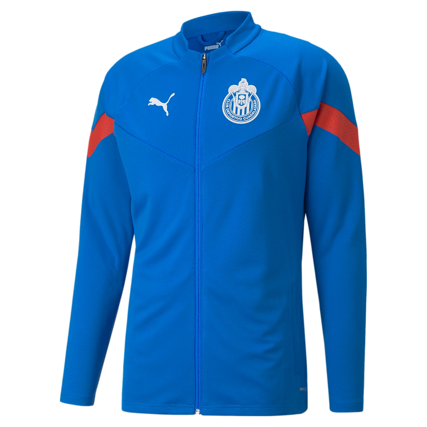 The Puma Chivas 2022-23 Training Jacket is designed for performance while showing pride for your favorite squad. Made with Puma dryCELL moisture-wicking material, combined with mesh panels for breathability, you can stay cool when your workout heats up. This jacket is finished with the iconic Chivas colors and an official team crest on the chest.